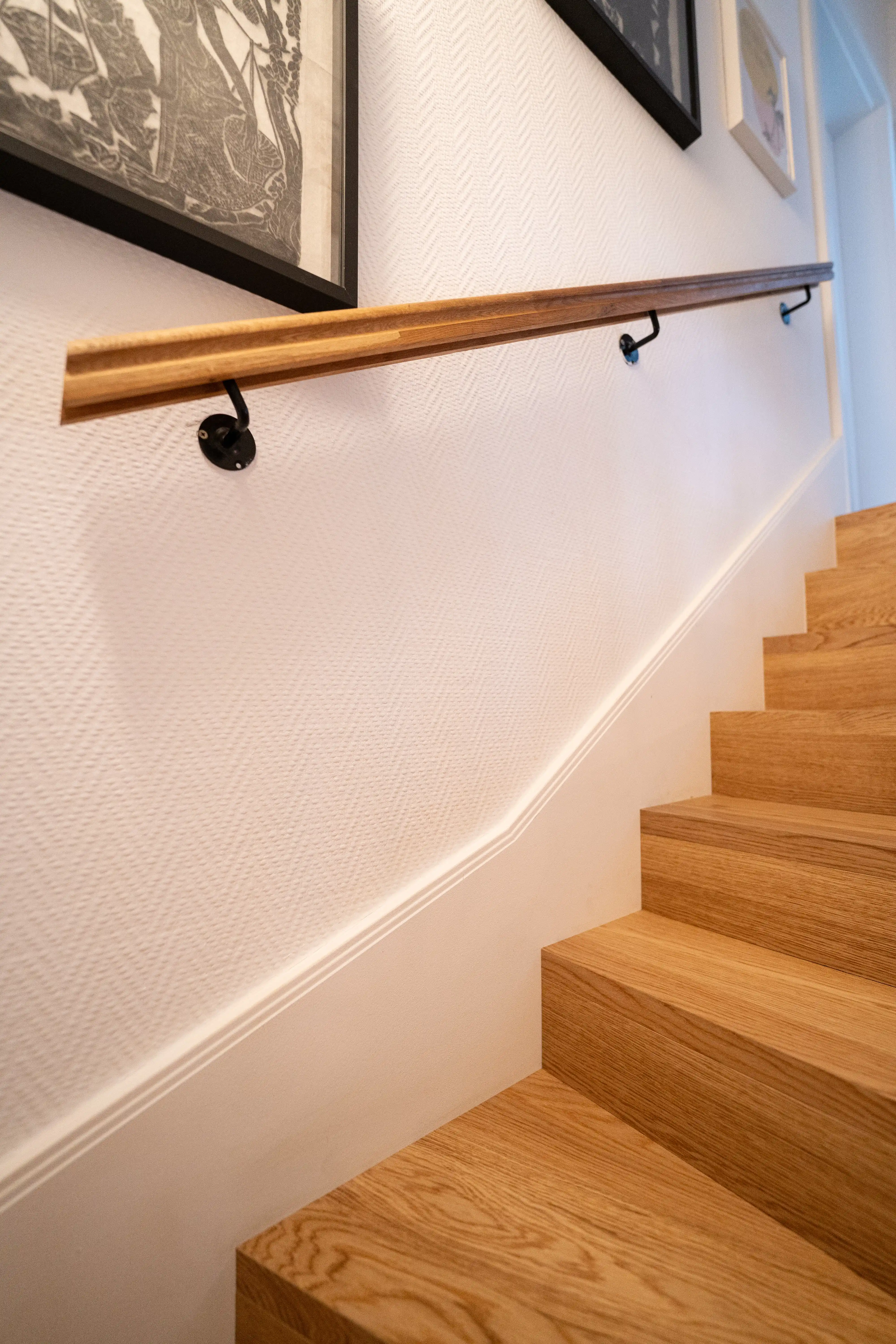 Afin d’accompagner cet escalier, nous avons réalisé un limon mural mouluré, apportant une finition élégante et structurée, en cohérence avec le style souhaité par le client.